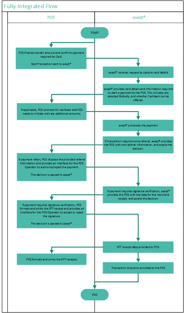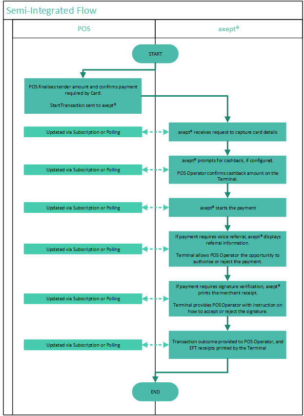 In this configuration, the EPOS provides the details required to start a transaction, and once started all other prompts are catered for by the axept® solution using the axept® UI. The integrated POS solution can monitor the progression of the transaction through status updates from Transaction Manager (via polling or publish and subscribe). Receipts are also handled by the axept® solution.